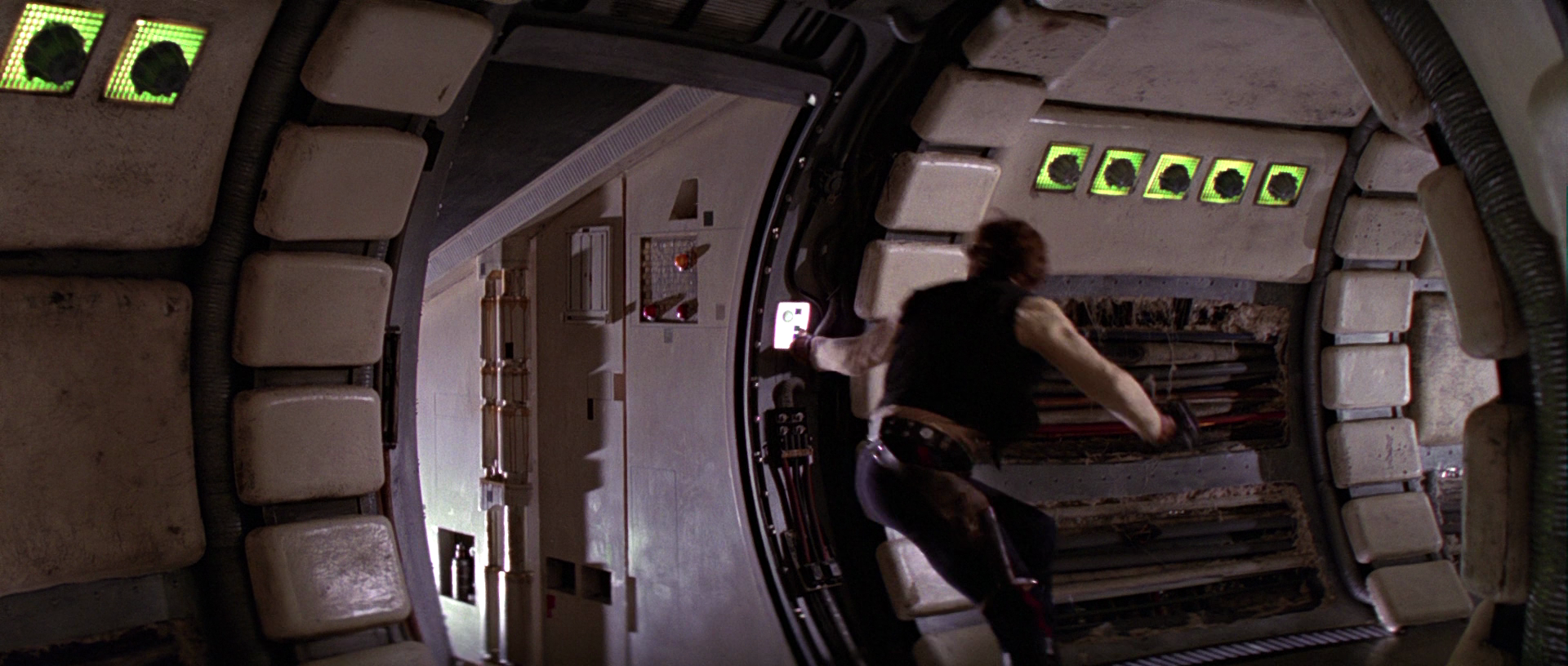 The main corridors in the Millennium Falcon are circular in cross section. They are lined with sectional padding material which has been removed in patches to allow access to machinery for Solo's many emergency repairs and modifications.